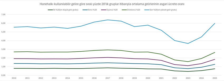 En alt gelir grubu asgari ücrete en yakın gelir düzeyine 0,86 asgari ücret ile 2017’de erişebilirken, 2010’dan bu yana ikinci yüzde 20’lik grup 2022-2024 yılları aralığında asgari ücretin altına ilk kez düşüyor; 2025’te 1,27 asgari ücretle toparlıyor.