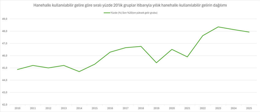 En üst gelir grubunda toplam gelirden alınan pay, 2010 yılında yüzde 44,9 olurken, 2023’te bu pay yüzde 48,3’e yükseldi. 2025’teyse yüzde 47,9 oldu.