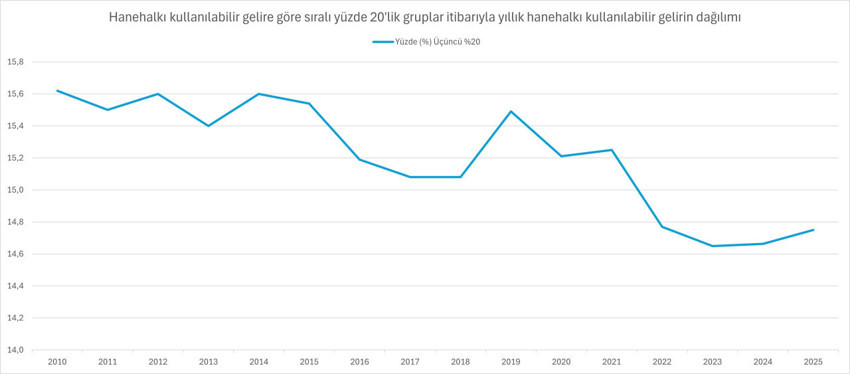 Üçüncü yüzde 20’lik gelir grubuna bakıldığında ise orta sınıftaki erime göze çarptı. 2010 yılında toplam gelirden yüzde 15,6 pay alan bu grup 2025’te son iki yıldır bir miktar yükseliş göstermesine karşın yüzde 14,8 paya ulaştı.