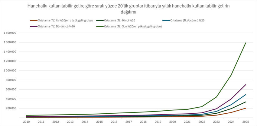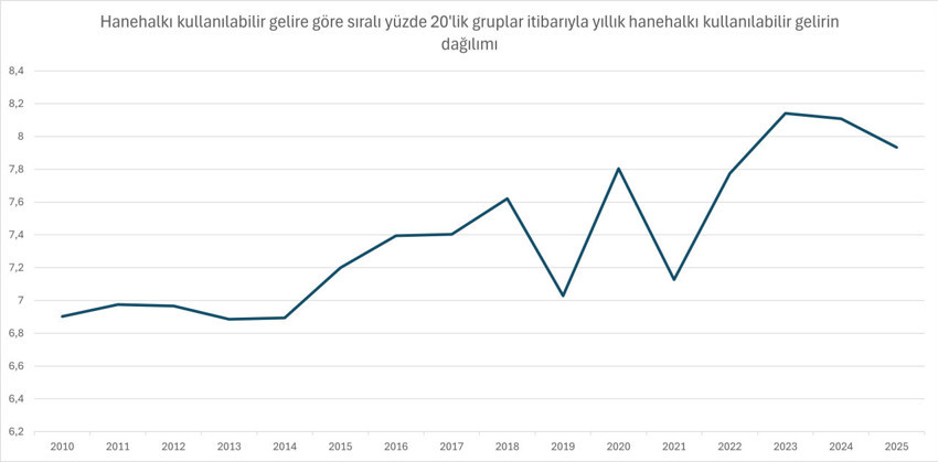 En yüksek gelir yüzde 20’lik grubunun yıllık ortalama gelirinin en alt yüzde 20’lik gelir grubunun ortalama gelirine oranı 2010’da 6,97 olurken, 2025’te 7,93 oldu.