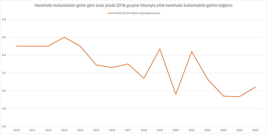 En alt gelir grubunun toplam gelirden aldığı pay, 2010’da yüzde 6,5 olurken, 2013’te 6,6’ya çıkmıştı. En düşük oran 2024’te 5,9 ile görüldü. 2025’te ise en alt gelir grubu toplam gelirin yüzde 6’sını alabildi.
