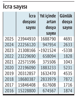 2025 yılı Kasım sonu itibarıyla karşılıksız çek tutarı 225 milyar liranın üzerine çıkarken, protestolu senet tutarı 81 milyar lirayı aştı. İcra dairelerine ulaşan icra iflas dosyası sayısı ise 2025 yılı sonu itibarıyla 24 milyonun üzerine çıktı. Bir başka ifade ile 86 milyonluk Türkiye’de her üç kişiden biri icralık oldu. 2025 yılı itibarıyla günlük icra dosyası sayısı ortalama 4 bin 691 oldu.