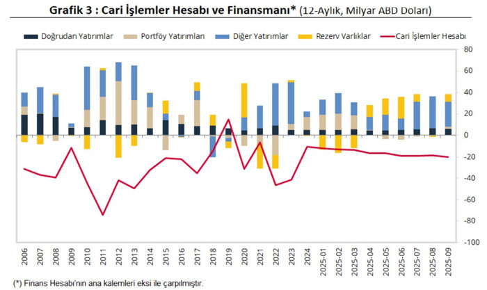 2025 yılı Eylül ayı yıllıklandırılmış cari açığın finansmanına net doğrudan yatırımlar 5,7 milyar ABD doları, net portföy yatırımları 2,0 milyar ABD doları, krediler 22,8 milyar ABD doları ve ticari krediler 1,9 milyar ABD doları katkı verdi. Net efektif ve mevduatlar 1,1 milyar ABD doları negatif yönlü etki ederken, Merkez Bankası döviz cinsinden net rezerv azalışı 6,8 milyar ABD doları oldu.