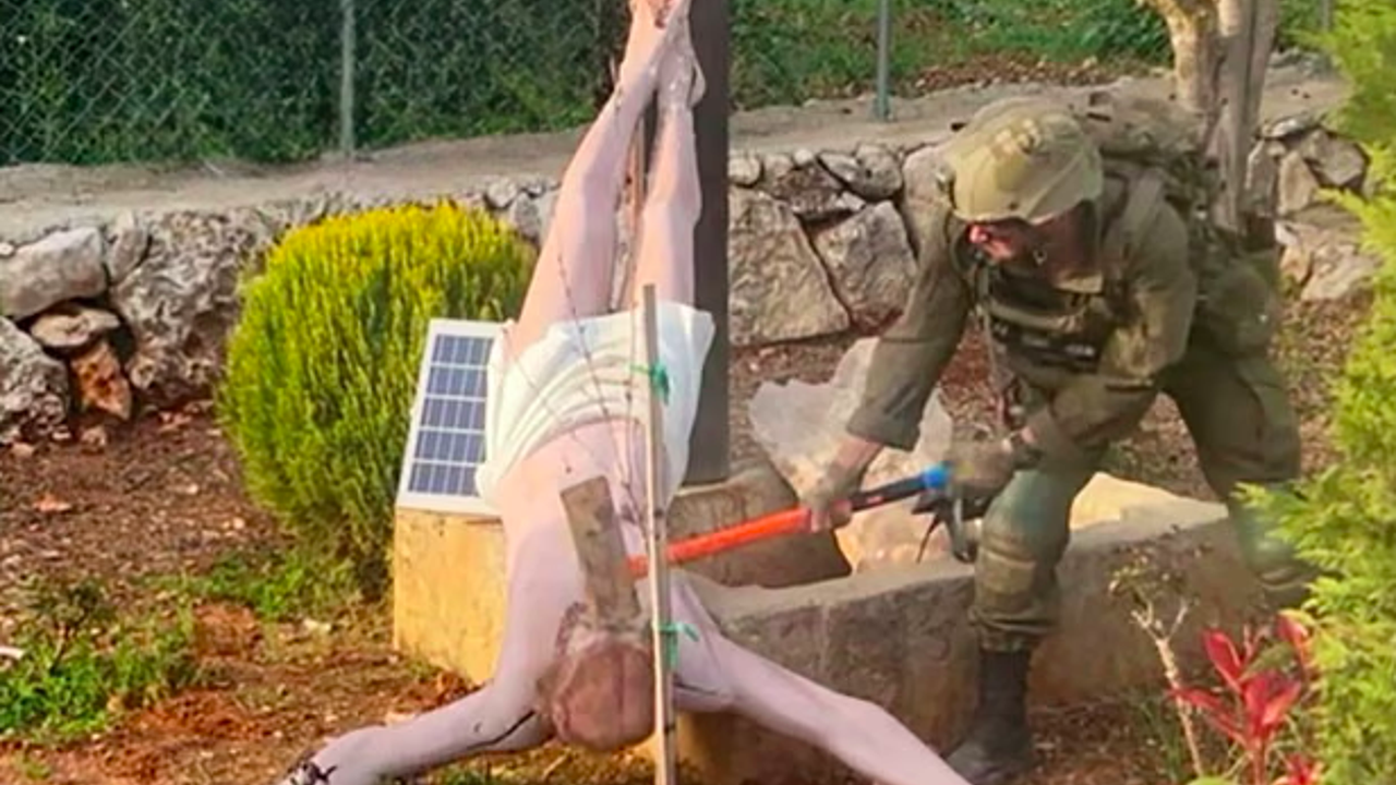 İsrail askeri yetkilileri, sosyal medyada dolaşan ve olayı gösteren görüntünün gerçek olduğunu tespit ettiklerini söyledi. Görüntüde, bir İsrail askerinin çarmıha gerilmiş İsa heykelinin başına balyozla vurduğu görülüyor.