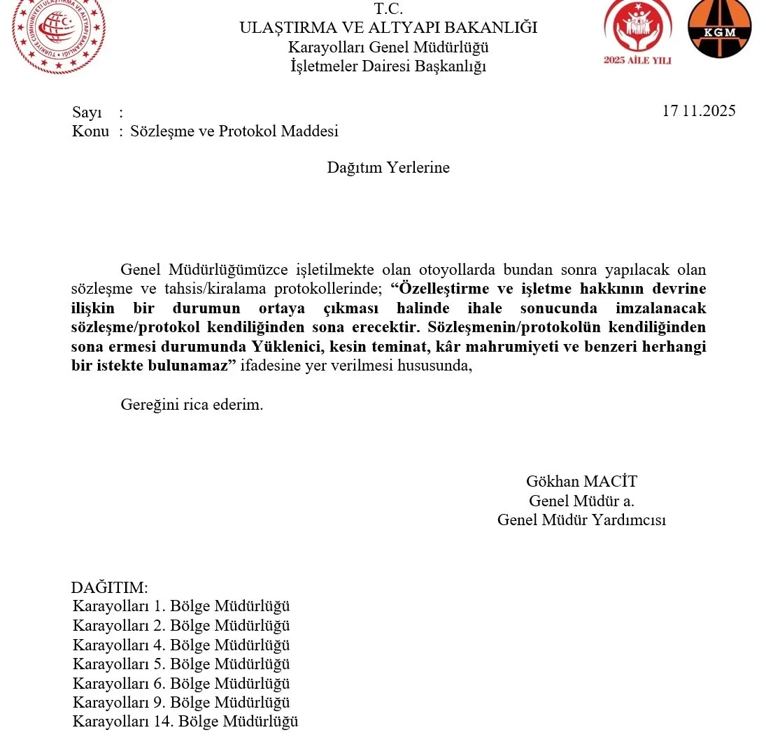 Ulaştırma Bakanlığı, 17 Kasım’da tüm bölge müdürlüklerine bir yazı gönderiyor: “Otoyollarda yeni sözleşme yapacaksanız şu maddeyi ekleyin: özelleştirme olursa sözleşme kendiliğinden düşer, tazminat da isteyemezsiniz.”