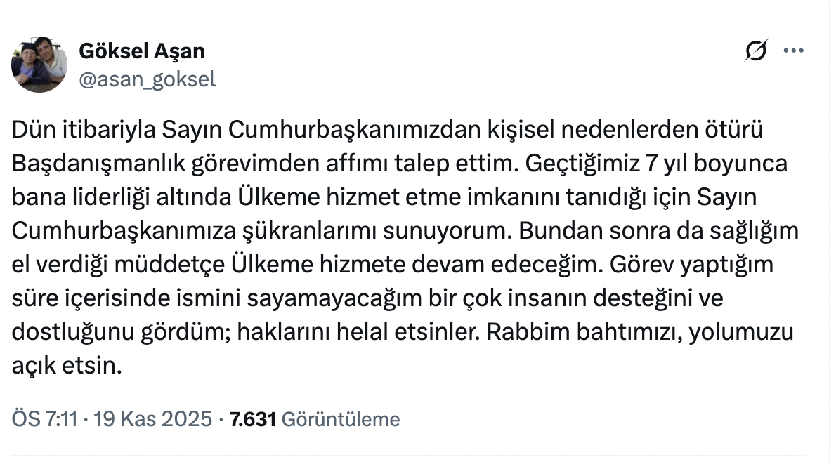 Cumhurbaşkanı Recep Tayyip Erdoğan'ın başdanışmanlarından olan Prof. Dr. Göksel Aşan, kişisel nedenlerden ötürü görevinden affını talep ettiğini açıkladı.