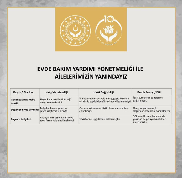 Aile ve Sosyal Hizmetler Bakanlığı ile Hazine ve Maliye Bakanlığı'nca hazırlanan, "Evde Bakım Yardımı Yönetmeliğinde Değişiklik Yapılmasına Dair Yönetmelik", Resmi Gazete'de yayımlanmıştı.