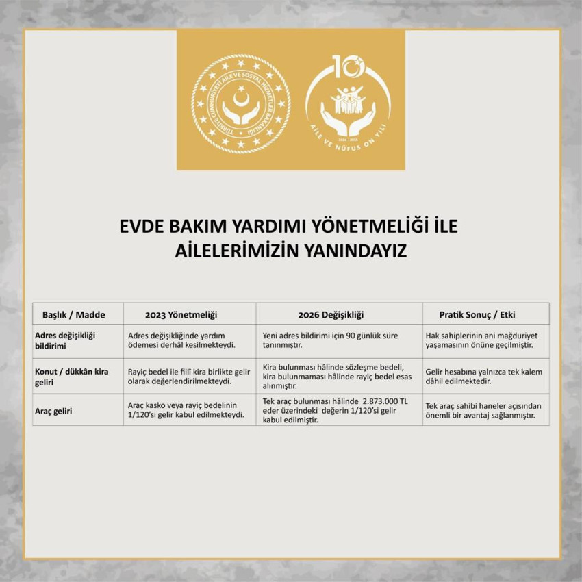 Buna göre, hane gelirinin hesaplanmasına ilişkin usul ve esaslar, evde bakımdan yararlananların lehine olacak şekilde yeniden düzenlendi.