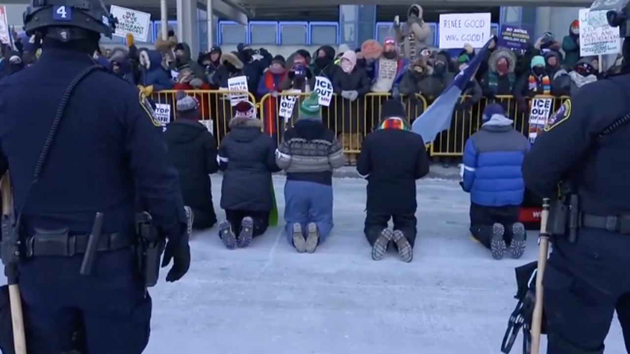 Cuma günü, yaklaşık 100 din adamı, ABD havayollarının ICE tarafından tutuklanan kişileri taşımayı reddetmesi çağrısında bulunan bir protesto gösterisi düzenlerken Minneapolis havaalanında gözaltına alındı.