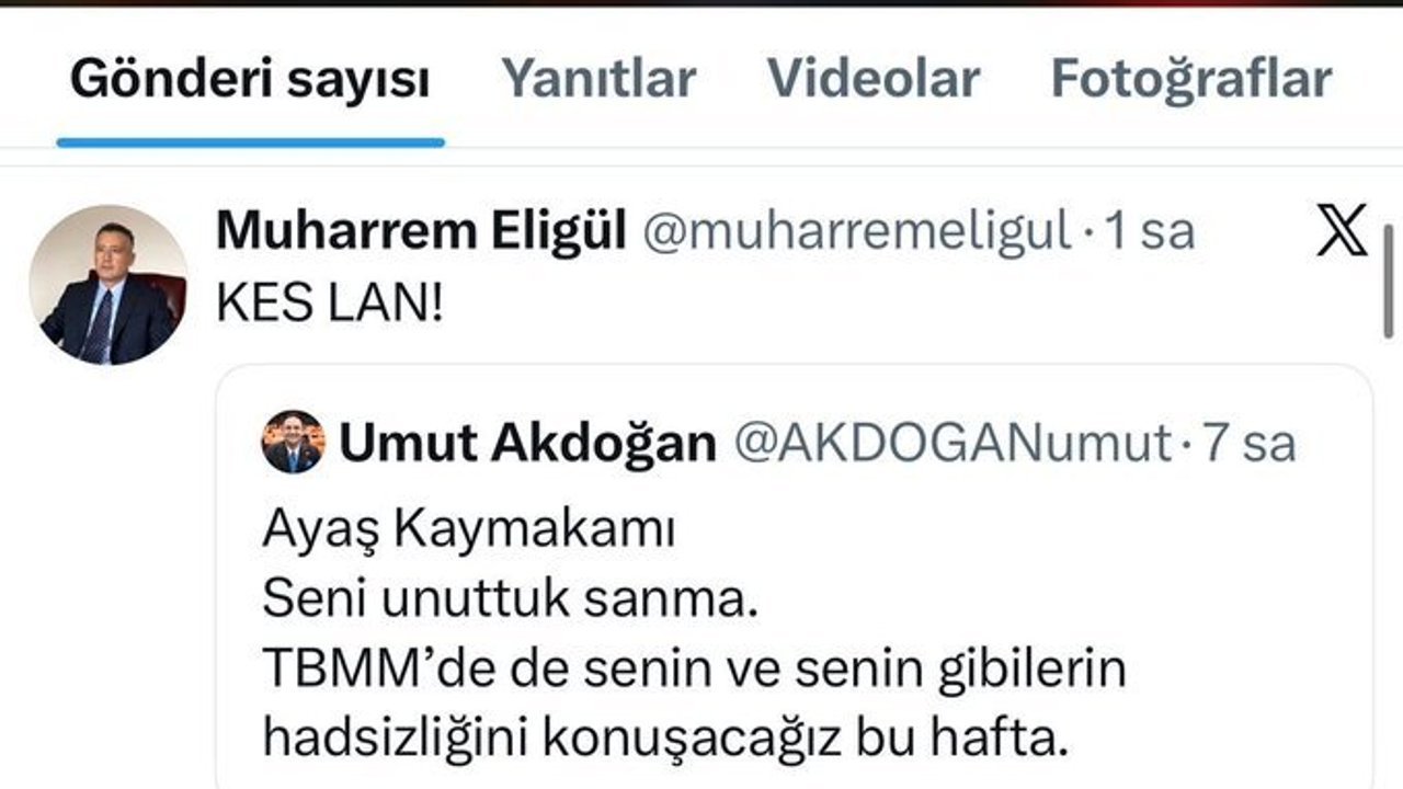 CHP Ankara Milletvekili Umut Akdoğan, sosyal medya hesabından yaptığı paylaşımda Eligül'ü gündemde tutacaklarını belirterek "Ayaş Kaymakamı, seni unuttuk sanma. TBMM'de de senin ve senin gibilerin hadsizliğini konuşacağız bu hafta" demiş, Eligül ise Akdoğan'a yönelik "Kes lan!" ifadesini kullanmıştı.