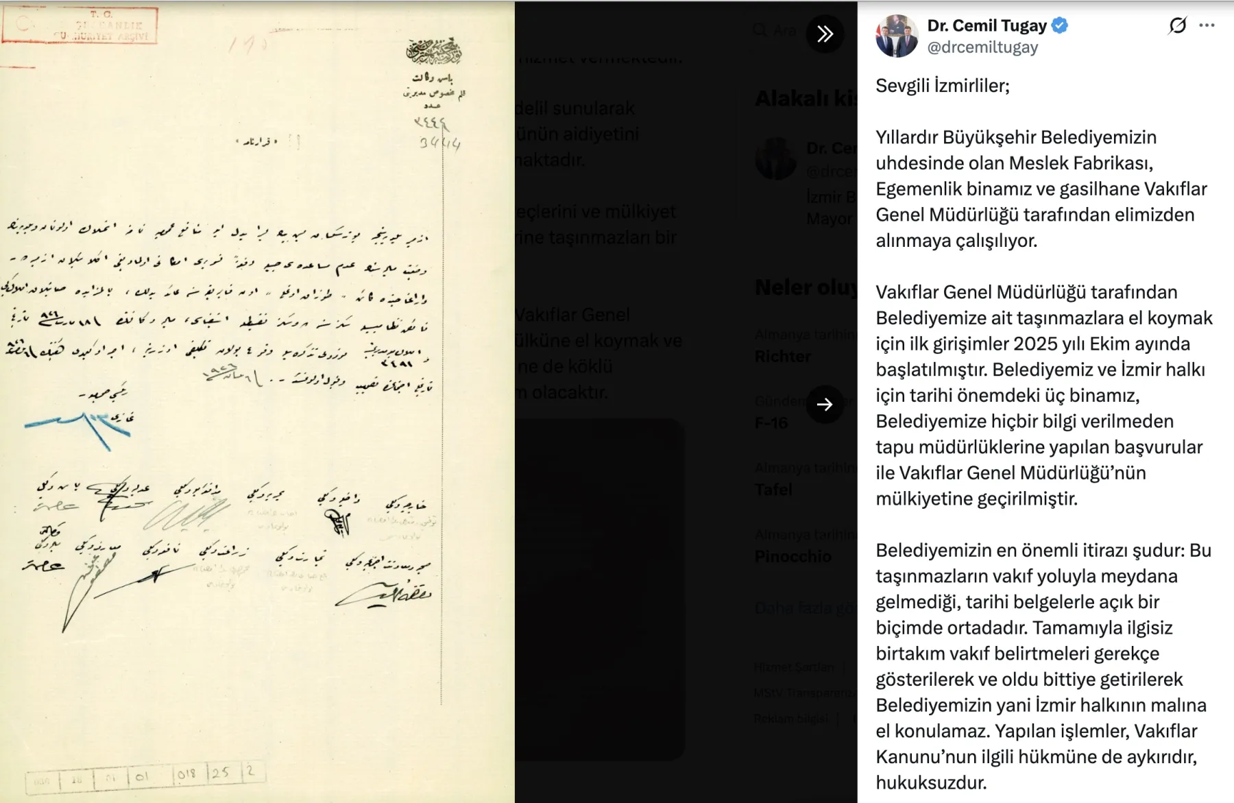 Belediyeye ait taşınmazların Vakıflar Genel Müdürlüğüne geçmesi için yürütülen sürecin Ekim 2025'te başlatıldığını ifade eden Tugay, "Belediyemiz ve İzmir halkı için tarihi önemdeki üç binamız, Belediyemize hiçbir bilgi verilmeden tapu müdürlüklerine yapılan başvurular ile Vakıflar Genel Müdürlüğünün mülkiyetine geçirilmiştir" dedi.