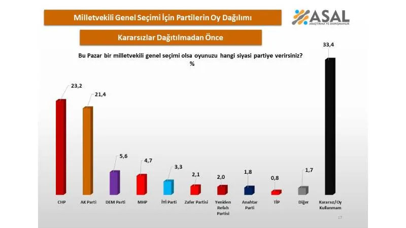Anket sonuçlarına göre kararsız seçmenlerin oranı yüzde 33,4 ile ilk sırada yer aldı. Kararsızların ardından CHP yüzde 23,2 ile ikinci, AKP ise yüzde 21,4 ile üçüncü sırada bulundu.