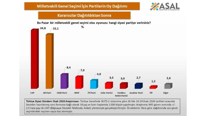 Asal Araştırma, Ocak 2026’da 26 ilde 2 bin kişiyle gerçekleştirdiği kamuoyu yoklamasının sonuçlarını paylaştı. Ankette katılımcılara, “Bu Pazar bir milletvekili genel seçimi olsa oyunuzu hangi siyasi partiye verirsiniz?” sorusu yöneltildi.