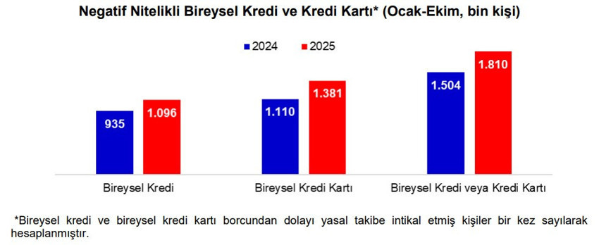 2025 yılı Ocak-Ekim döneminde, bir önceki yılın aynı dönemine göre bireysel kredi veya bireysel kredi kartı borcundan dolayı yasal takibe intikal etmiş kişi sayısı yüzde 20 artarak 1 milyon 810 bin kişi oldu.