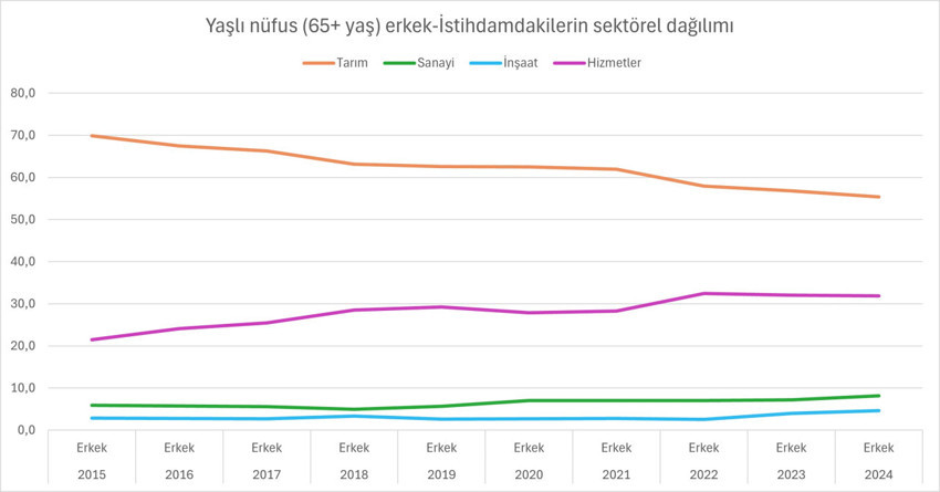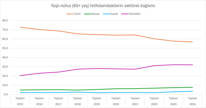 ım sektöründe yoğun olduğu görülüyor ancak yıllar içinde bu oran da geriliyor. 2015 yılında tarımda işgücü olarak bulunan 65 yaş üstü nüfusun oranı yüzde 72,8 olurken, 2024’te bu oran yüzde 56,9 oldu.