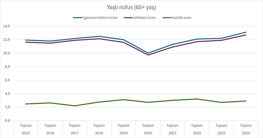 Yaşlı nüfusun işgücüne katılma oranı 2024 yılında %13,1 oldu. Bu oran, 2015 yılında yüzde 11,9 oranında bulunuyordu. 65 yaş üstü nüfusun 2020-2021 pandemi dönemi haricinde işgücüne iş gücüne katılımının arttığı görüldü.