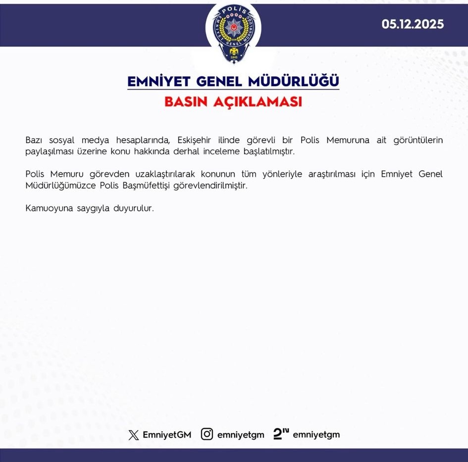 Görüntülerin sosyal medyada yayılmasının ardından Emniyet Genel Müdürlüğü harekete geçti. Emniyet'in resmi X hesabından yapılan açıklamada polis memurunun görevinden uzaklaştırıldığı ve konu hakkında inceleme başlatıldığı belirtildi.